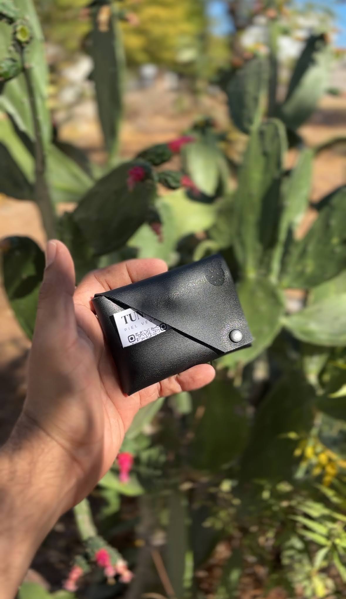 Diseño origami con corte diagonal en tapas. Cuenta con dos ranuras para tarjetas y espacio para billetes y monedas.